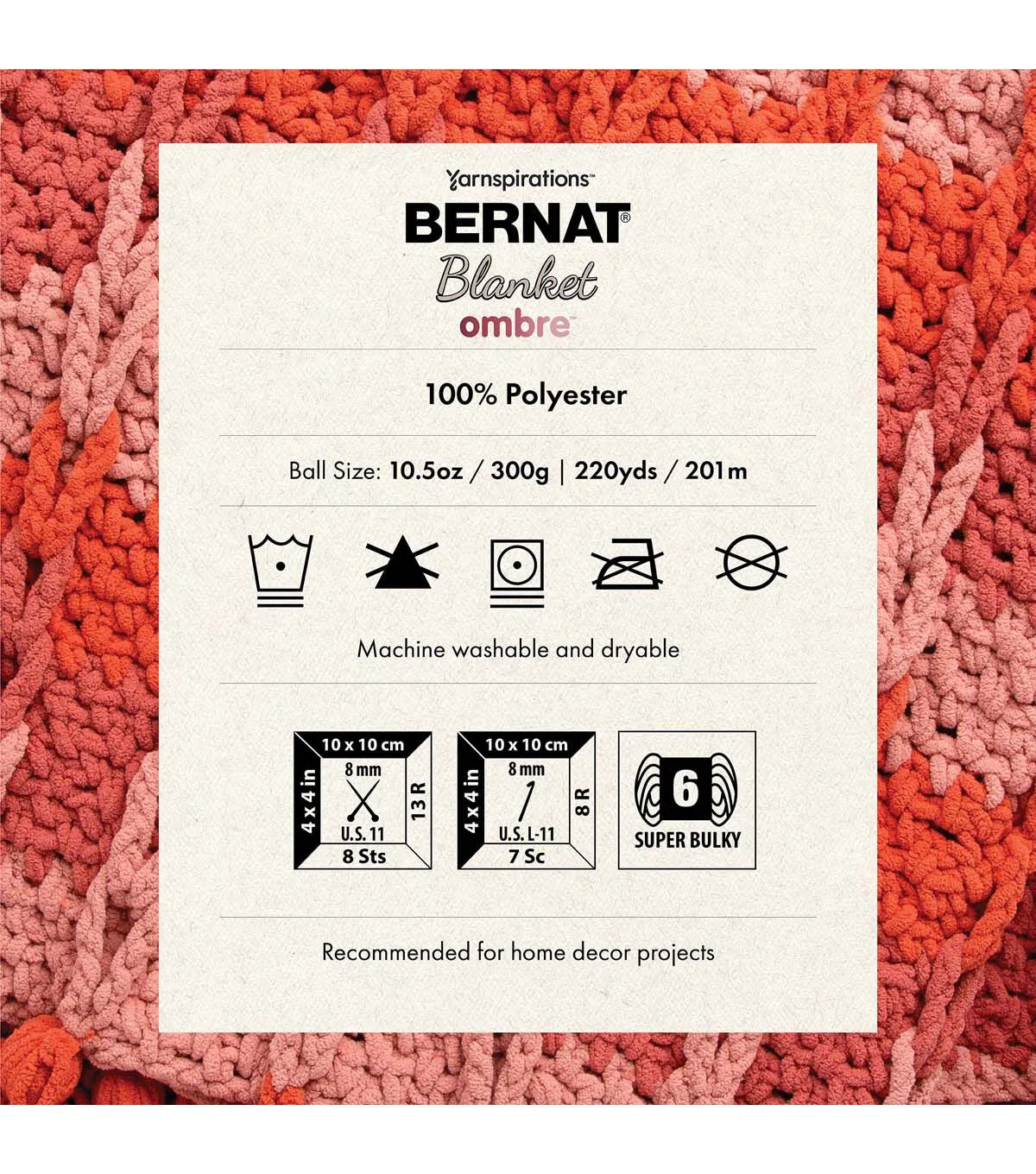 Eye-catching, gradating shades add a whole new dimension to our popular Bernat Blanket line of products. Blanket Ombre is the same chenille-style yarn you love, but with gradual color changes that add soft transitions to the look of any finished project. This blending of colors, one into the next, introduces a new dimension to your home decor projects. The super bulky weight stitches up quickly, making it a perfect choice for afghans, blankets, pillows and poufs. Available in a wide range ombre shades, discover the tones that best complement your home. The 100% polyester fiber is conveniently machine washable and dryable for easy-care enjoyment.