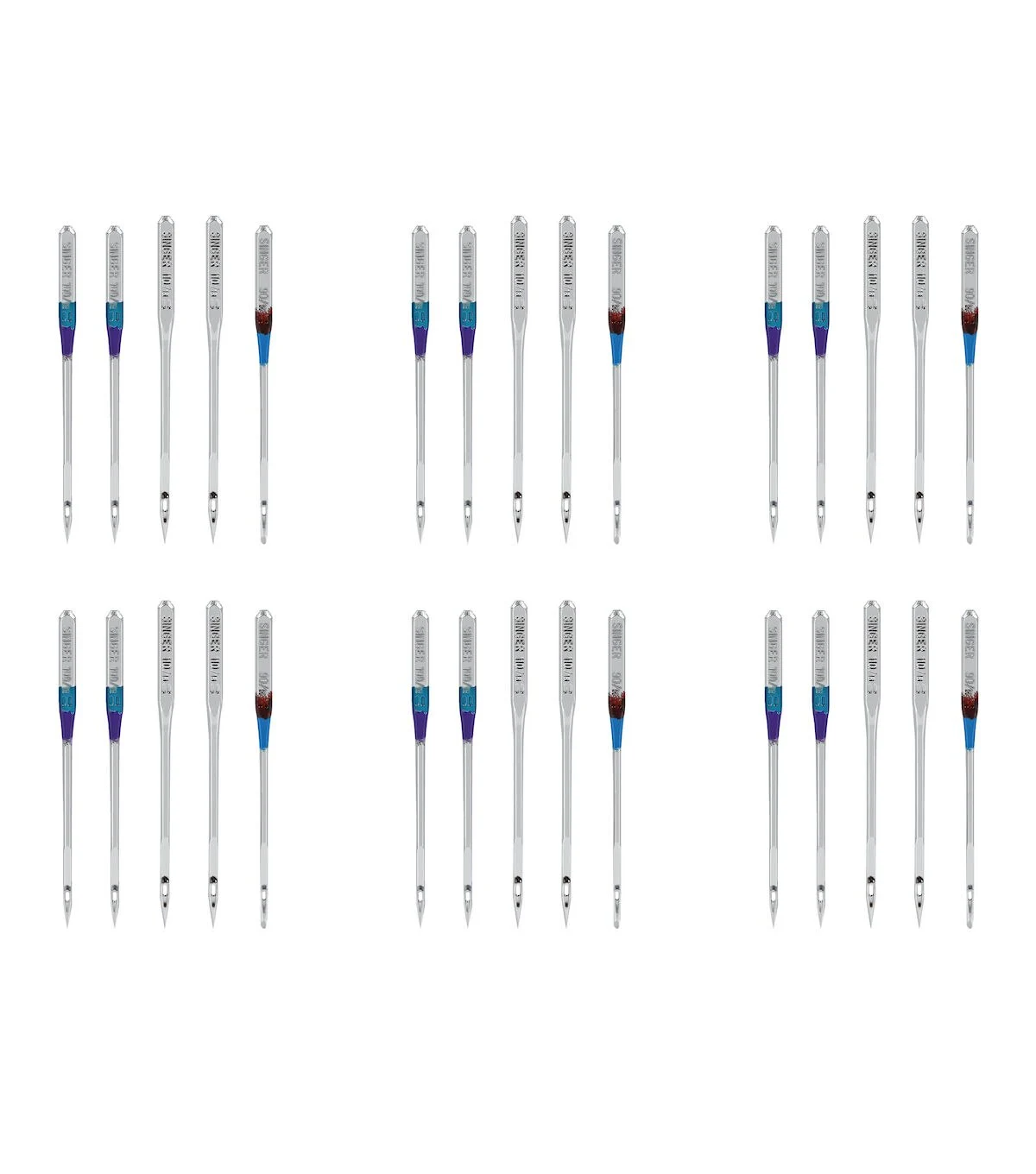 Use the Singer Universal Heavy Duty Sewing Machine Needles for stitching heavy fabrics such as denim or leather. These needles come in assorted sizes and you can choose the needle that best suits the fabric you"re working on. The blue-hued needles are designed with a sharp point and slender eye for sewing jeans and other denim fabric while the brown-colored needles are for use on leather and vinyl. They are designed with a triangular point to make a clean hole in non-woven materials. This pack also includes color-coded needles in size 90/14 for use on leather, size 100/16 for use on denim and size 110/18 that are ideal to be used on heavyweight woven fabrics. Needles come in a carrying case with sizes marked over the needle slots and can be used on Singer, Brother, Kenmore and other quality sewing machines.