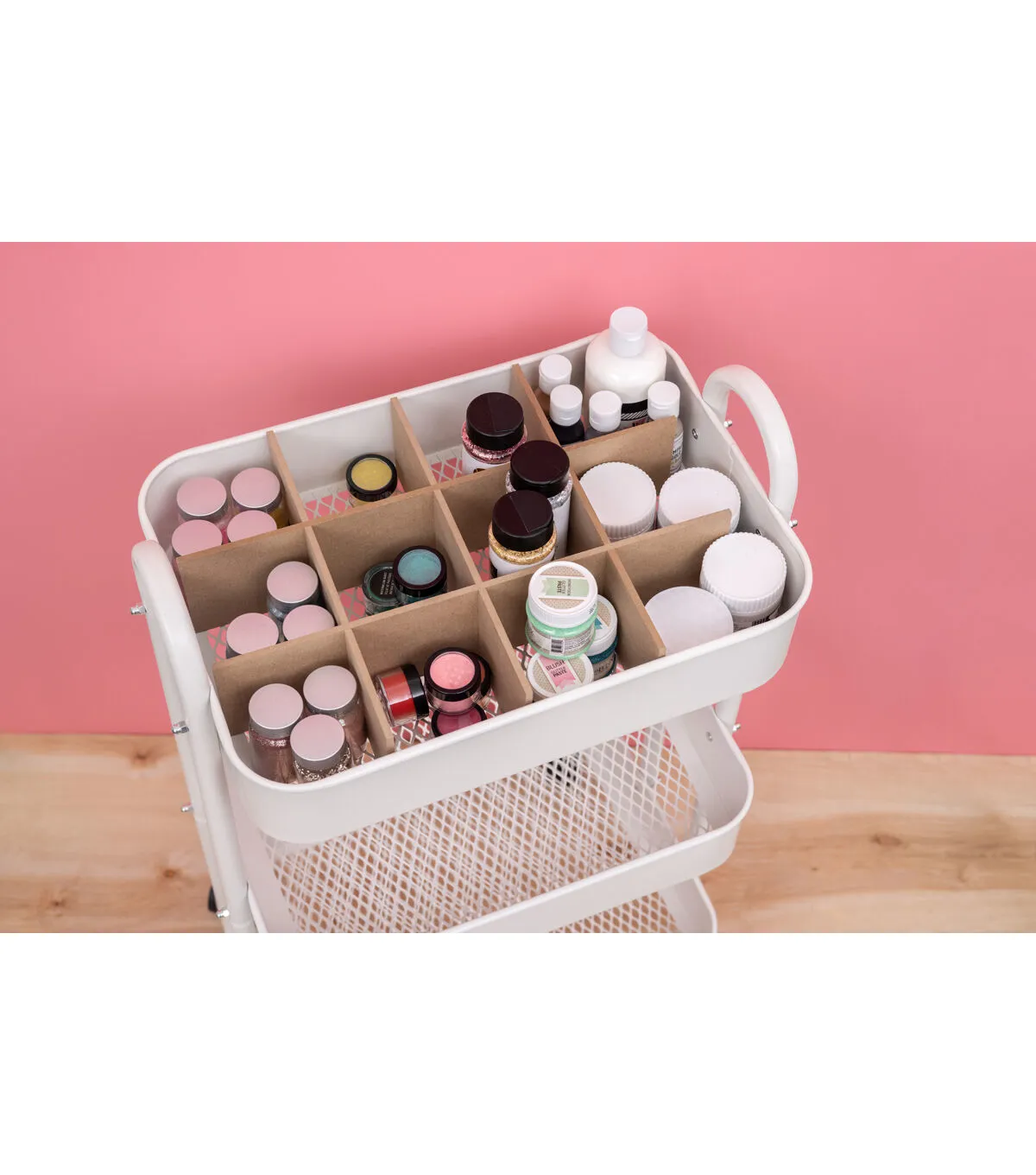 Accessorize your A La Cart with cart dividers. These space savers keep your projects and tools separated and organized, and can be adjusted to fit any major cart on the market. Each divider features 12 separate bins to keep paint bottles, accessories, and other supplies secure. This package includes 5 pieces to assemble one 12-section cart divider for the A La Cart (sold separately).