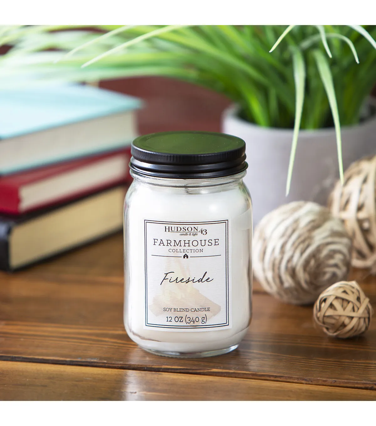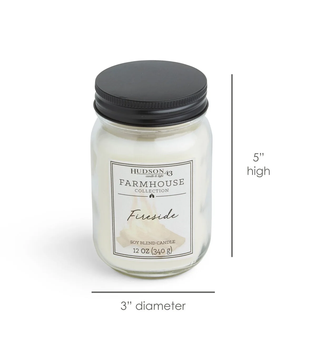 The Hudson 43 Farmhouse Collection Fireside Mason Jar Candle offers a modern yet rustic fragrance in a beautiful package that goes with any decor. This 12-ounce clear mason jar comes with a white wax candle and a matte black lid that screws on. It includes the notes of smoke, spice and firewood.