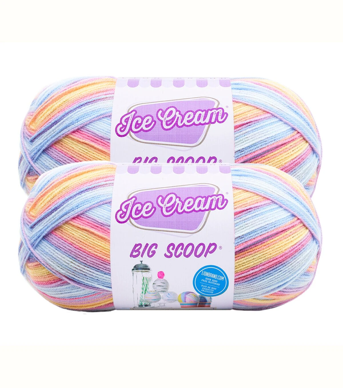 Ice Cream Big Scoop is the same soft, easy-care yarn as Ice Cream, with even more yardage "C one ball is enough to make a baby set or a whole blanket! The delightful, unique color combinations come together in beautiful self-striping colorways to give that handcrafted look to your projects. This lightweight yarn will be your new favorite for babies, toddlers, and kids.