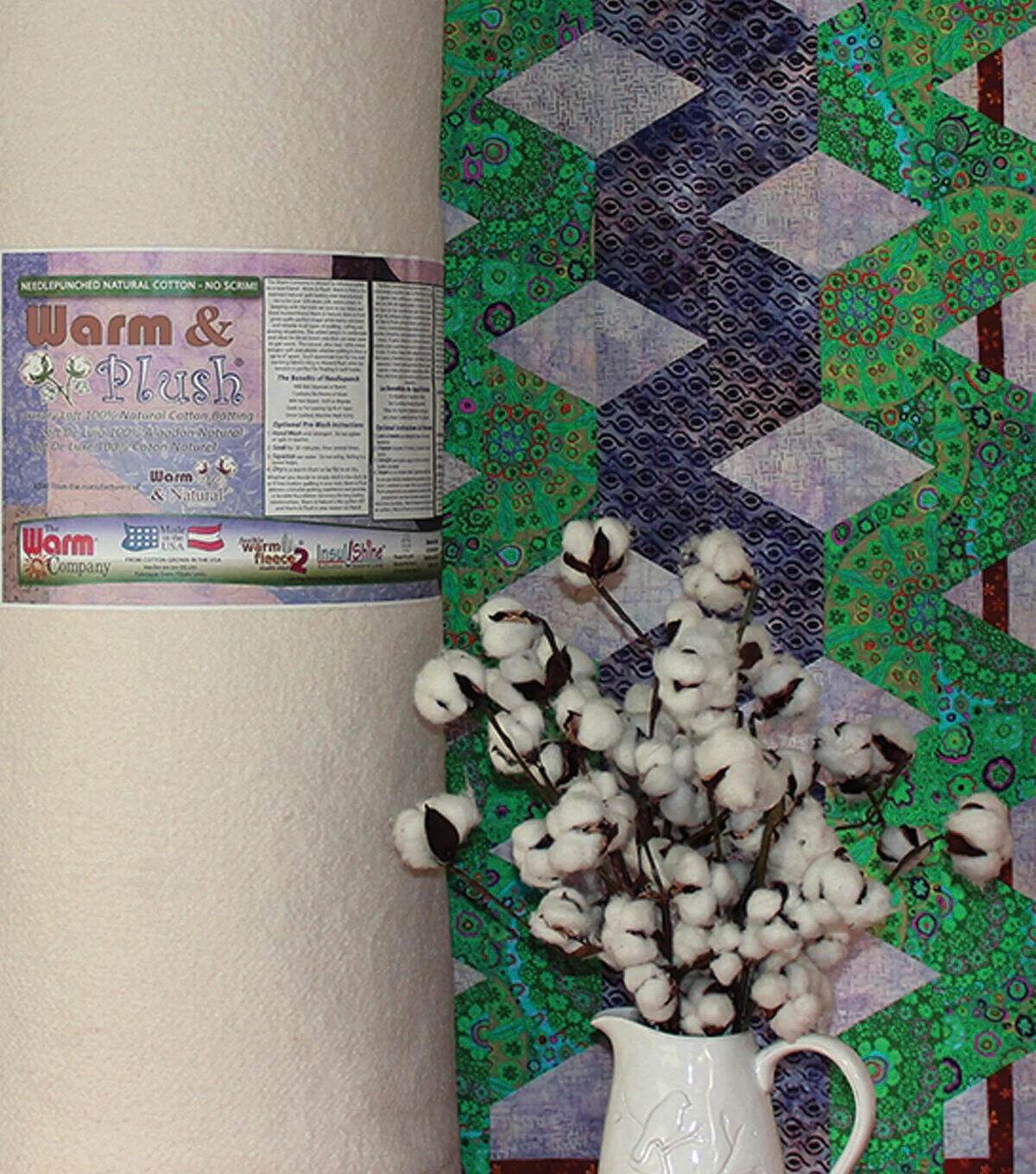 Warm & Plush is the warmest 100% natural cotton batting ever manufactured. Warm & Plush is made with 50% more soft, cotton than other Warm brands. In keeping with the Warm tradition, Warm & Plush is needlepunched without glue providing the perfect drape in all types of quilting and crafting situations. The added weight is ideal for those loved ones that can never seem to get warm! The super clean cotton remains soft and pliable whether quilting is close or up to 6" apart. Warm & Plush has the perfect tension for floating in quilt frames. Whether you decide to stitch in the ditch or free motion is your style, Warm & Plush delivers a blissful quilting experience and provides a durable foundation for necessary for a quilt loved through many generations.